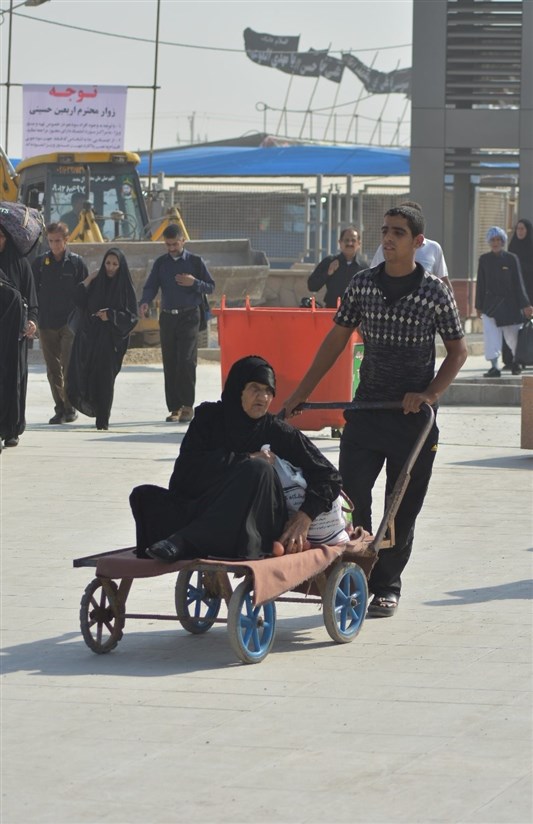 برخی خانوادههایی که کودک یا فرد میانسال دارند با استفاده از گاریها و ابزار مختلف اعضای خانواده خود را برای زیارت اباعبدالله(ع) تسهیل میکنند.