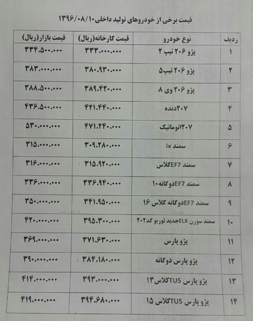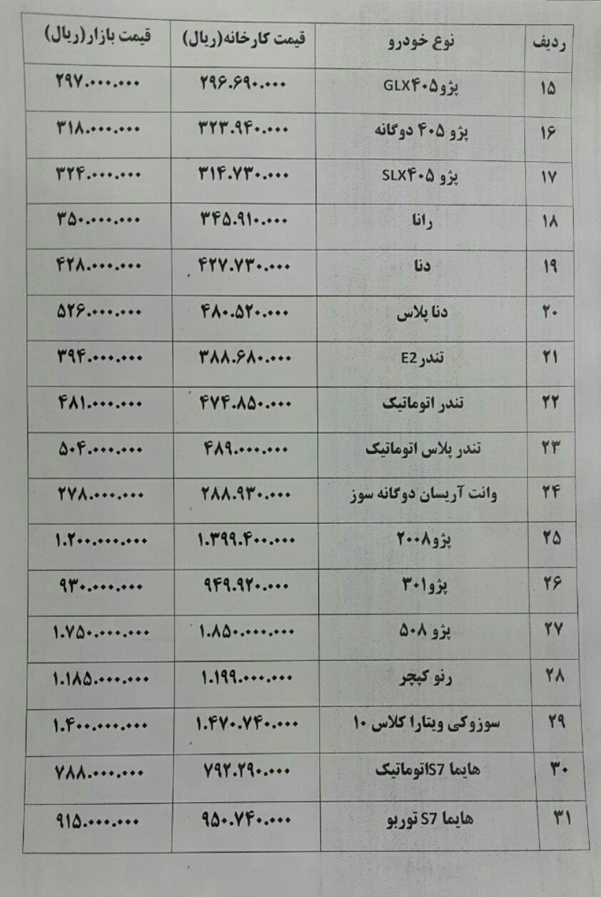 قیمت تعدادی از خودروها در بازار امروز به‌شرح زیر است:
