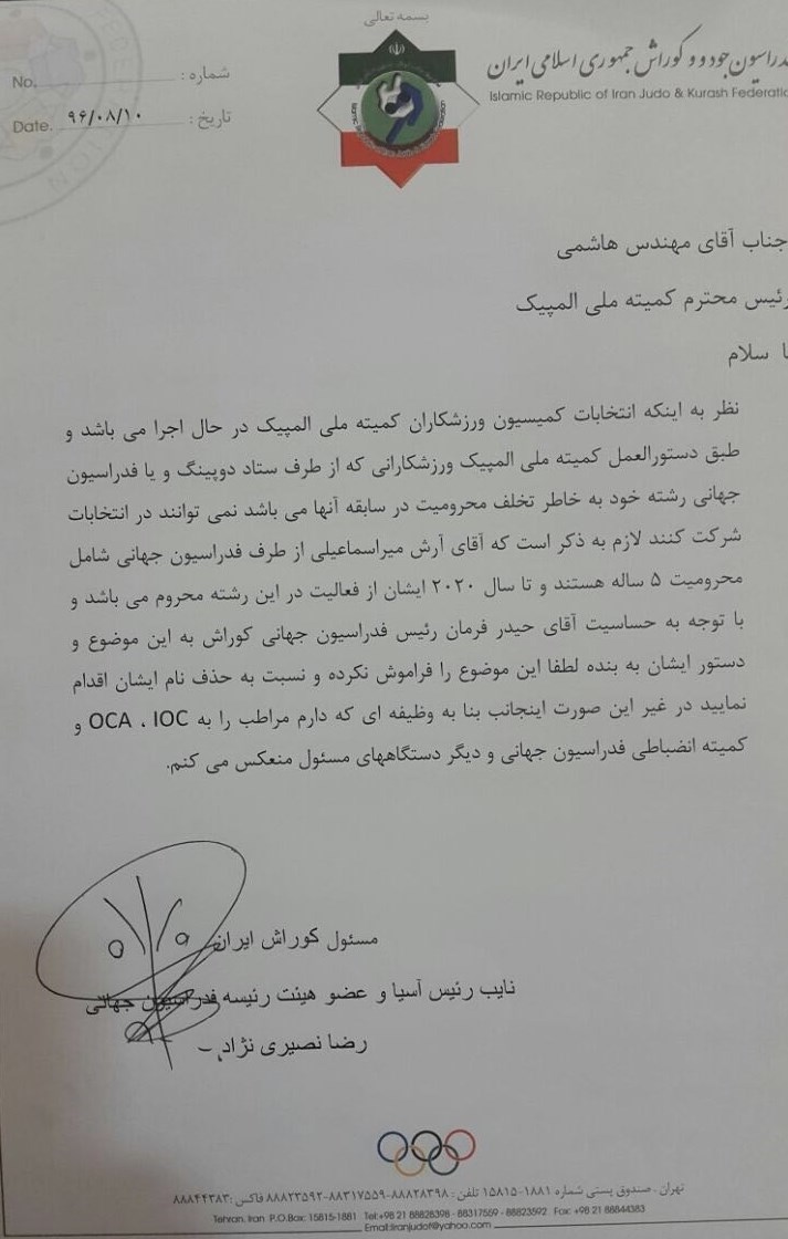 در همین خصوص رضا نصیرینژاد، مسئول کوراش ایران با ارسال نامهای به کیومرث هاشمی رئیس کمیته ملی المپیک ضمن اشاره به محرومیت 5 ساله آرش میراسماعیلی از سوی فدراسیون جهانی کوراش به عدم حذف پرافتخارترین جودوکار تاریخ ایران معترض شده است. نصیرینژاد صراحتا اعلام کرده در صورت عدم رعایت این موضوع به مقامات IOC، OCA و حتی کمیته انضباطی فدراسیون جهانی کوراش اطلاع رسانی خواهد کرد.