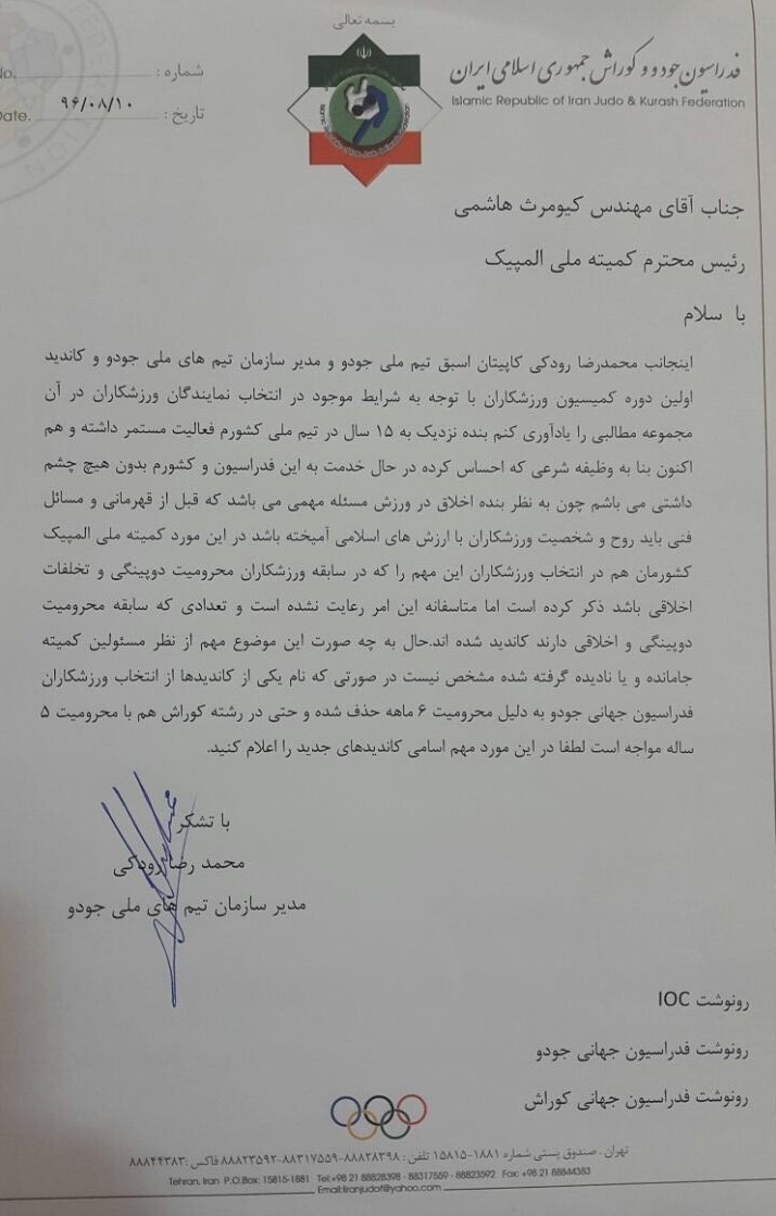 همچنین محمدرضا رودکی، مدیر سازمان تیمهای ملی جودو نیز به عنوان یکی از کاندیداهای انتخابات کمیسیون ورزشکاران با ارسال نامهای دیگر به رئیس کمیته المپیک نسبت به ثبتنام ورزشکاران محروم و دوپینگی معترض و خواستار اعلام لیست جدید کاندیداها شده است.