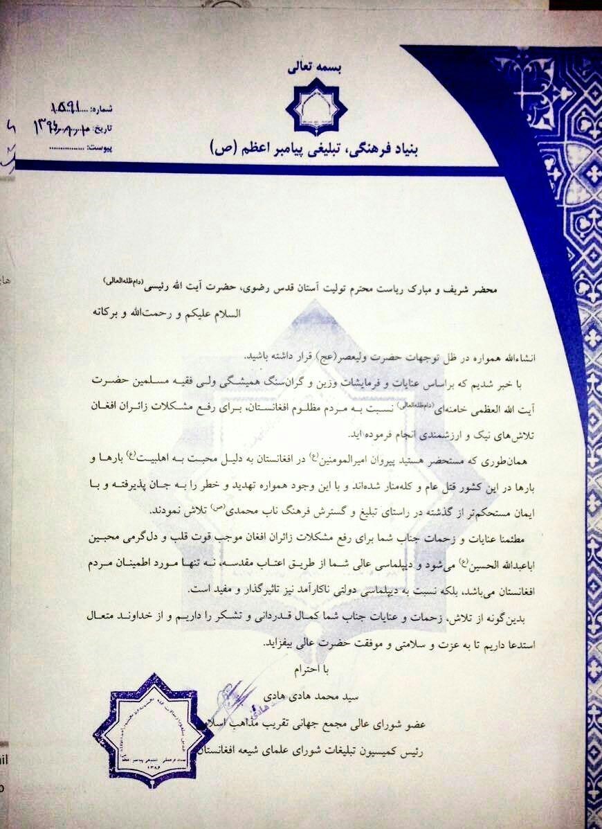 همانطوری که مستحضر هستید، پیروان امیرالمومنین(ع) در افغانستان بهدلیل محبت به اهلبیت(ع) بارها و بارها در این کشور قتلعام و کلهمنار شدهاند و با این وجود همواره تهدید و خطر را بهجان پذیرفته و با ایمان مستحکمتر از گذشته در راستای تبلیغ و گسترش فرهنگ ناب محمدی تلاش نمودند.