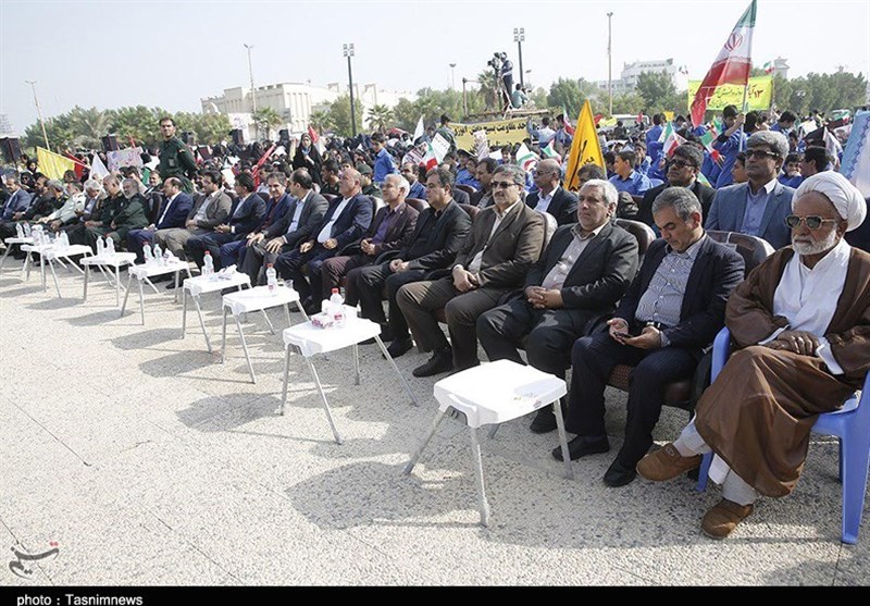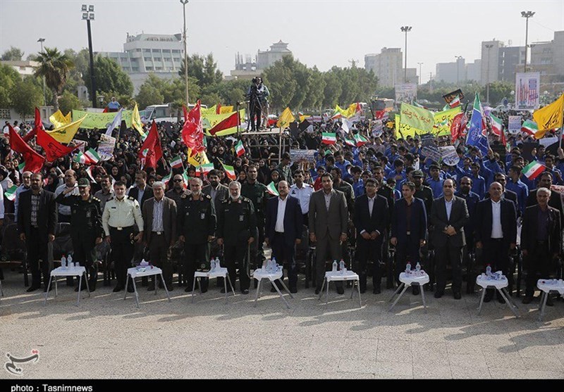 به گزارش خبرگزاری تسنیم از بوشهر، مردم همیشه در صحنه بوشهر پیش از ظهر امروز با تجمع باشکوهی در کنار آبهای خلیج فارس با شعارهای ضد استکباری، بار دیگر، فرهنگ استعمار ستیزی، ظلم ستیزی و استکبار ستیزی خود را نشان دادند.