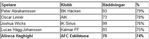 در ادامه این خبر آمده است: علیرضا حقیقی در نیمفصل اول لیگ برتر سوئد مصدوم شد اما از زمان درمانش در 16 بازی به میدان رفت و به لحاظ آماری بسیار خوب کار کرد. طبق آمار و ارقام سایت لیگ برتر سوئد او در 74 درصد موقعیتهای تیم حریف نجاتدهنده تیم اسکیلستونا بود که همین مسئله علیرضا حقیقی را در میان دروازهبانهای برتر قرار میدهد.