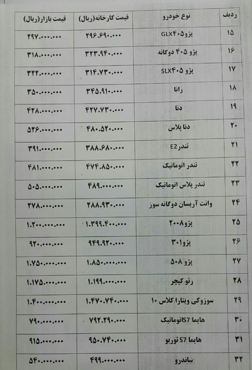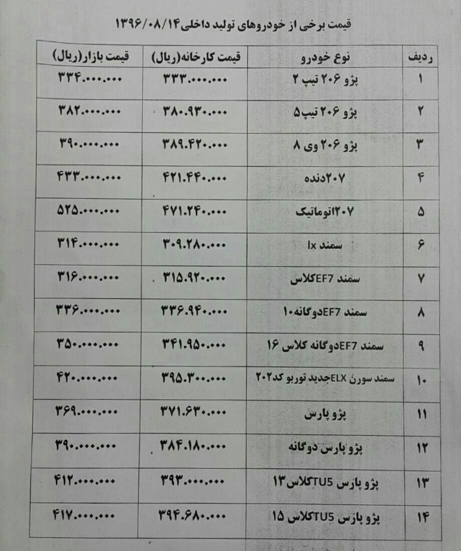 قیمت تعدادی از خودروها در بازار امروز به شرح زیر است: