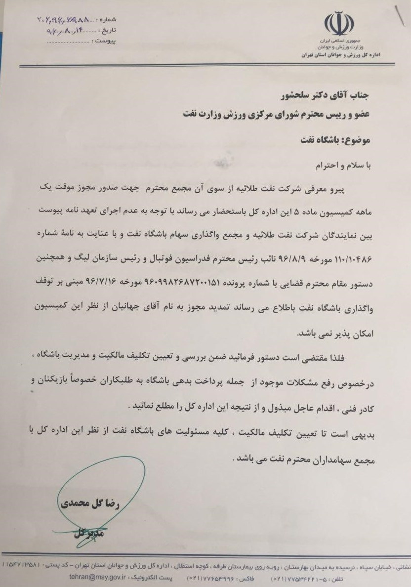 رضا گلمحمدی، مدیر کل اداره ورزش و جوانان استان تهران، پیش از این و در جلسهای که با حضور معاون وزیر ورزش و جوانان، رئیس فدراسیون فوتبال و یکی از اعضای هیئت واگذاری باشگاه نفت تهران برگزار شده بود، اعلام کرد وزارت نفت را مالک قانونی باشگاه نفت میداند. صحبتهای گلمحمدی مبنی بر این بود که مالکیت فردی به نام جهانیان از نظر اداره کل ورزش و جوانان استان تهران که باید مجوز فعالیت باشگاهها در استان را صادر کند، قانونی نیست. با این حال ادامه این کشمکش بین گل محمدی و جهانیان به اینجا ختم شده که مالکیت باشگاه نفت از فردی که این باشگاه را در اختیار گرفته بود، سلب شده است.