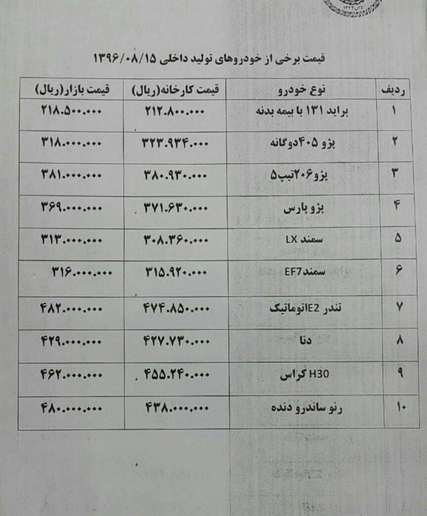 لیست تعدادی از خودروهای داخلی در بازار امروز به شرح زیر است: