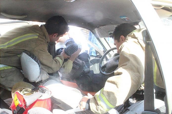 مهدی حیدری؛ فرمانده آتشنشانان اعزام شده به محل حادثه درباره جزئیات حادثه اظهار کرد: یک دستگاه خودروی سواری پراید حین حرکت در خیابان به علت نامعلومی به شدت با دیوار حاشیه خیابان برخورد کرده بود و دو نفر سرنشین سالخورده این وسیله نقلیه در داخل اتاقک خودروی سواری محبوس شده بودند.