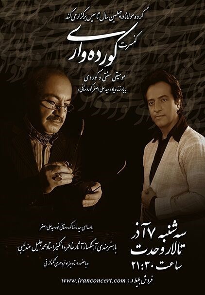 به گزارش باشگاه خبرنگاران پویا، در این کنسرت که به یاد بزرگمرد موسیقی کردستان استاد علی اصغر کردستانی در تالار وحدت اجرا خواهد شد، سیدرضا صلواتی(کردستانی) نوه سیدعلیاصغر کردستانی، به عنوان خواننده، گروهِ مولانا را همراهی میکند.