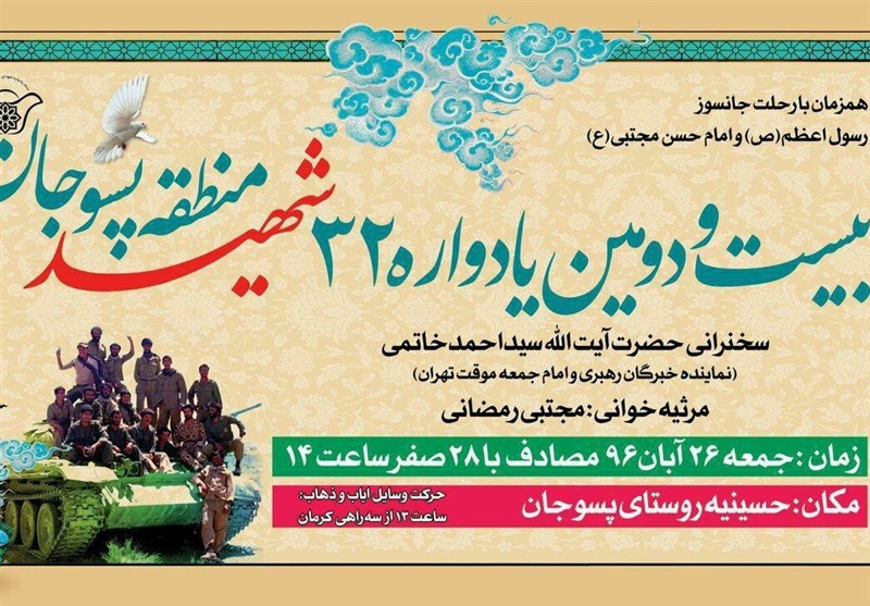 به گزارش تسنیم ، بیست و دومین یادواره 32 شهید روستای پسوجان سیرجان جمعه 26 آبانماه جاری در حسینیه این روستا برگزار میشود.