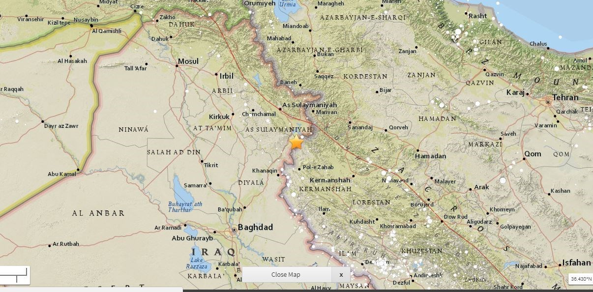این رسانه همچنین مرکز این زمینلرزه را در 15 مایلی ناحیه کوهستانی استان سلیمانیه و ساعت رخ دادن حادثه را 9:18 شب به وقت محلی اعلام کرد.