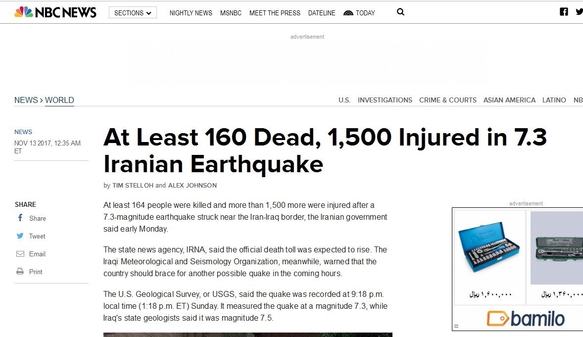 به گزارش خبرنگار اجتماعی خبرگزاری تسنیم، رسانههای خارجی ضمن پرداختن به حادثه دلخراش زلزله شب گذشته کرمانشاه با انتشار تصاویری به شرح این حادثه و تعداد جانباختگان و مصدومان زلزله پرداختند.