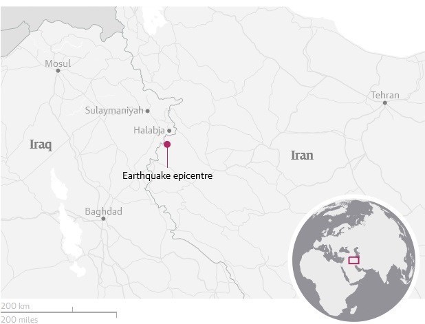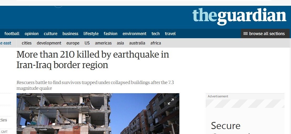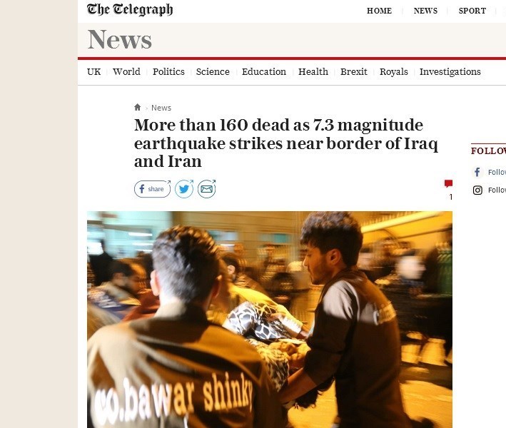 تلگراف در این رابطه نوشت:"یک روز پس از یک زلزله شدید در منطقه مرزی ایران و عراق، چندین نفر کشته و صدها تن زخمی شدند.