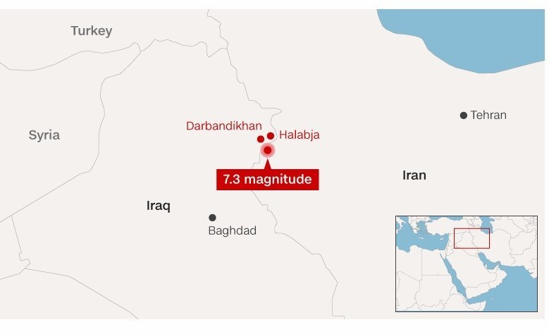 تحقیقات زمین شناسی ایالات متحده اعلام کرد که مرکز این زمینلرزه در 30 کیلومتری جنوب غربی حلبچه در نزدیکی مرز شمال شرقی با ایران قرار دارد.