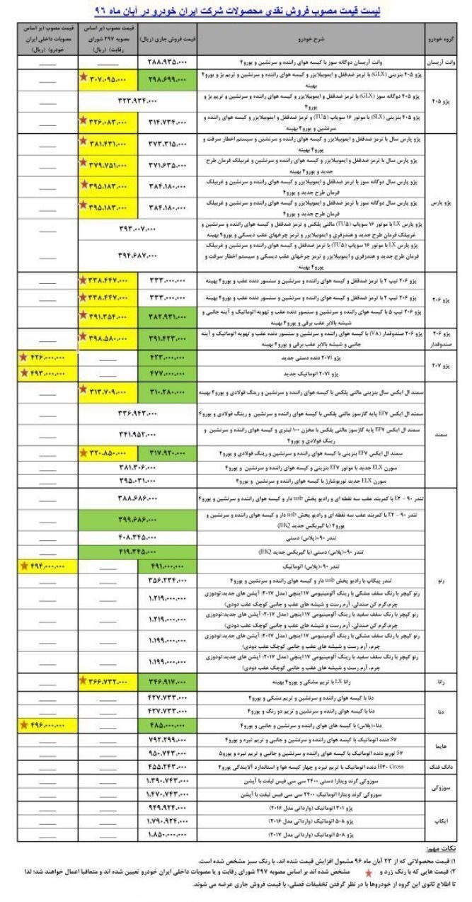 همچنین قیمت هایی که با رنگ زرد مشخص شده اند بر اساس مصوبه 297 شورای رقابت یا مصوبات داخلی ایران خودرو تعیین شده اند و متعاقبا اعمال خواهند شد لذا تا اطلاع ثانوی این گروه از خودرو ها با در نظر گرفتن تخفیفات فصلی، با قیمت فروش جاری (همان قیمت های سبز رنگ) عرضه می شوند. در واقع فعلا افزایش قیمت برای آبان ماه طبق رنگ سبز مشخص شده است و زمان اعمال قیمت های جدیدتر یعنی رنگ زرد تا اطلاع ثانوی مشخص نیست.