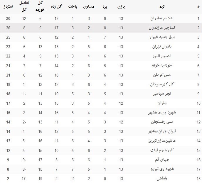 در پایان دیدارهای هفته سیزدهم،‌ تیم نفت مسجد سلیمان با وجود تساوی مقابل برق جدید همچنان با 30 امتیاز در صدر جدول باقی‌ماند و تیم نساجی نیز با برتری مقابل صبای قم با 26 امتیاز به رده دوم  جدول صعود کرد. در انتهای جدول نیز همچنان راه‌آهن بدون برد و با دو امتیاز در قعر جدول باقی‌مانده است.