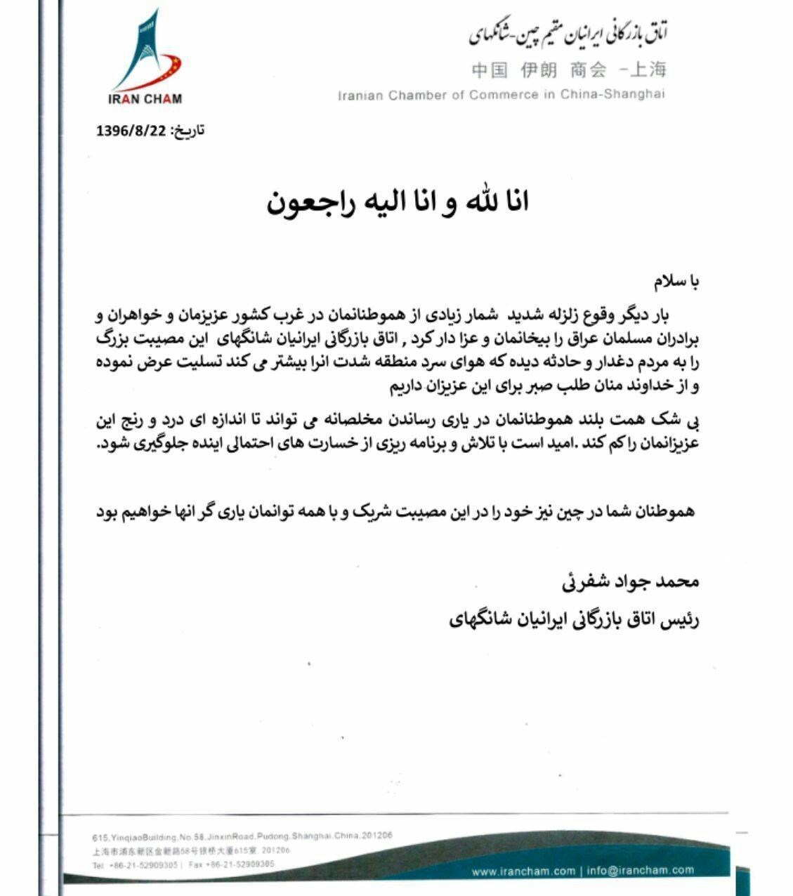 همچنین تجار ایرانیان ساکن چین از طریق اتاق بازرگانی ایرانیان مقیم چین - شانگهای پیام تسلیت دیگری منتشر کردهاند. این پیام را محمد جواد شفرئی، رئیس اتاق بازرگانی ایرانیان شانگهای منتشر کرده است.