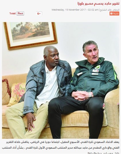 روزنامه الریاضیه نیز در شماره امروز خود (چهارشنبه) به نقل از یک منبع موثق نوشت: فدراسیون فوتبال عربستان هفته آینده جلسهای به منظور ارزیابی عملکرد فنی بائوسا و نتایج اخیر بازیهای تدارکاتی تیم ملی فوتبال عربستان در ریاض تشکیل خواهد داد. همچنین ماجد عبدالله، مدیر تیم ملی فوتبال عربستان گزارشی درباره اردوی اخیر اروپایی و بازیهای تدارکاتی ارائه میدهد. این گزارش نقش مهمی در سرنوشت سرمربی آرژانتینی خواهد داشت.