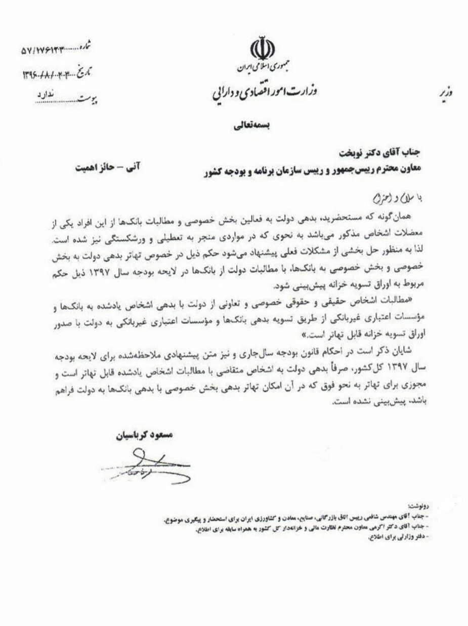 خبرگزاری تسنیم، چند روز قبل کرباسیان در نامه ای به رئیس سازمان برنامه و بودجه پیشنهاد تهاتر بدهی دولت به بخش خصوصی با طلب بانکها در بودجه 97را مطرح کرد.