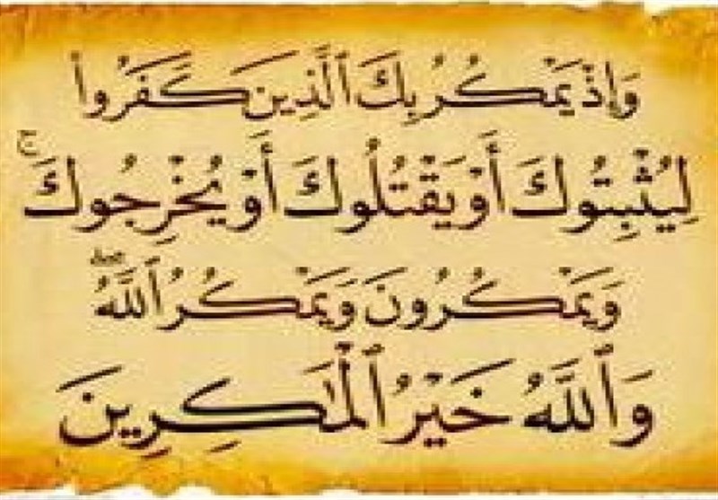 خداوند پیغمبر خود را از تصمیم آنان مطلع کرد و این آیه شریفه را نازل فرمود: «وَ إِذْ یَمْکُرُ بِکَ الَّذِینَ کَفَرُوا لِیُثْبِتُوکَ أَوْ یَقْتُلُوکَ أَوْ یُخْرِجُوکَ‏ وَ یَمْکُرُونَ وَ یَمْکُرُ اللَّهُ وَ اللَّهُ خَیْرُ الْماکِرین‏؛ و [یاد کن‏] هنگامى را که کافران در باره تو نیرنگ مى‏‌کردند تا تو را به بند کَشَند یا بکُشند یا [از مکّه‏] اخراج کنند، و نیرنگ مى‌‏زدند، و خدا تدبیر مى‏‌کرد، و خدا بهترین تدبیرکنندگان است.» ...