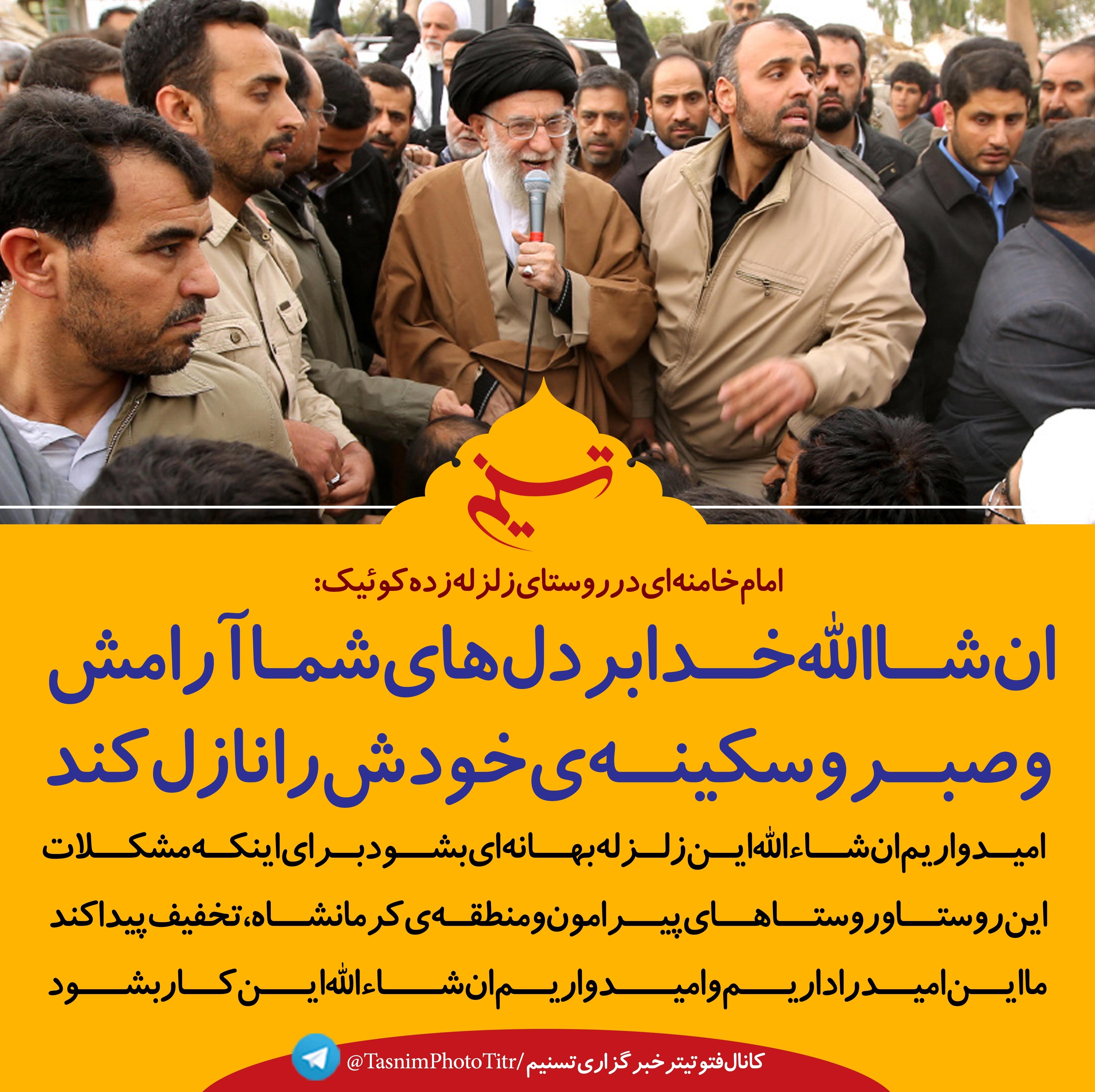 رهبر انقلاب، دقایقی پیش در روستای زلزله‌زده کوئیک فرمودند:ان‌شاءالله خدا بر دلهای شما آرامش و #صبر و سکینه‌ی خودش را نازل کند