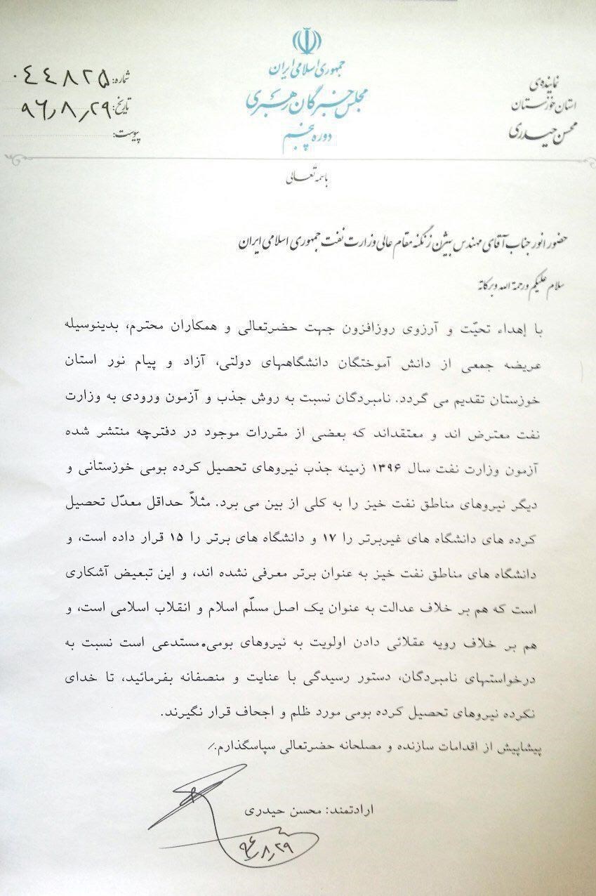 آیتالله محسن حیدری عضو مجلس خبرگان رهبری نیز در نامهای نسبت به ضوابط شرکت در آزمون نفت انتقاد کرد. در ادامه متن نامه را مشاهده میکنید.