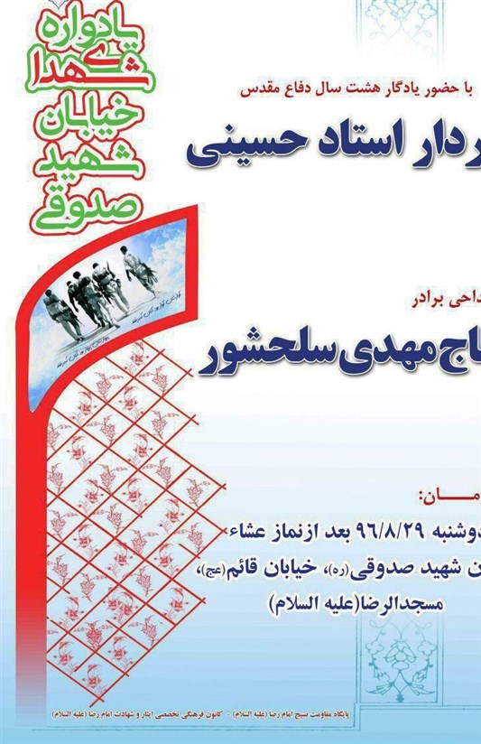 به گزارش خبرگزاری تسنیم از قم، شانزدهمین مراسم گرامیداشت شهدای خیابان صدوق قم امشب با حضور سردار سرتیپ دوم پاسدار علی استاد حسینی فرمانده سابق سپاه سمنان و البرز در مسجد امام رضا (ع) زنبیل آباد برگزار شد.