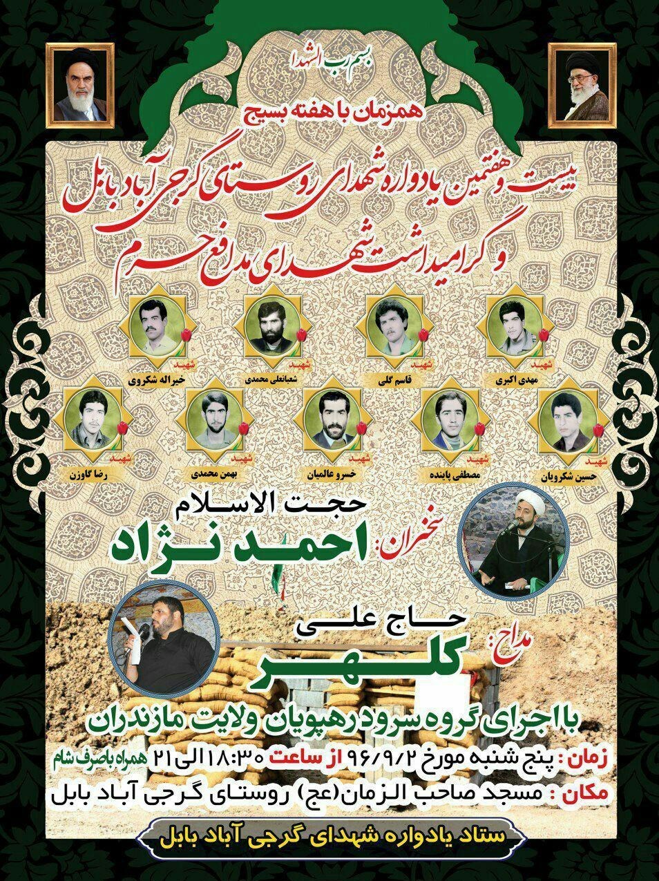 بیست و هفتمین یادواره 9 شهید روستای گرجی آباد شهرستان بابل و مدافعان حرم همزمان با هفته بسیج پنجشنبه دوم آذر برگزار می‌شود.