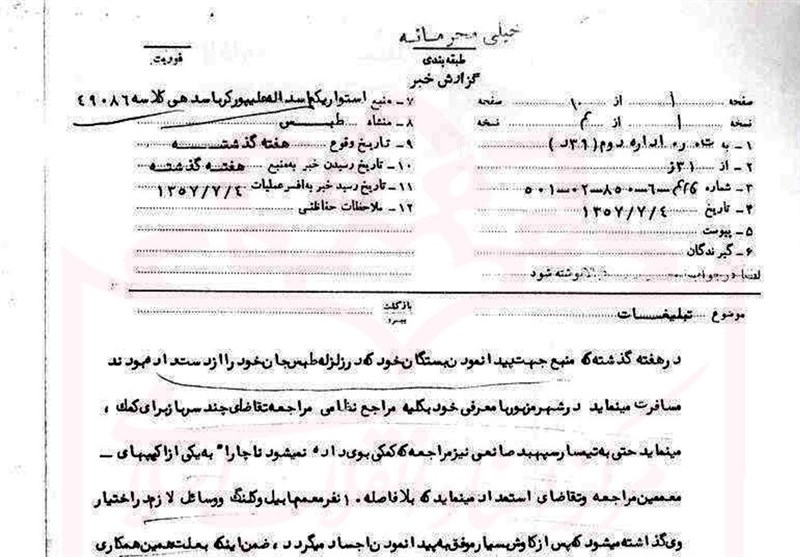 در این گزارش آمده بود: «در هفته گذشته که منبع، جهت پیدا نمودن بستگان خود که در زلزله طبس جان خود را از دست داده بودند مسافرت مینماید، در شهر مزبور با معرفی خود به کلیه مراجع نظامی مراجعه تقاضای چند سرباز برای کمک مینماید؛ حتی به تیمسار سپهبد صانعی هم مراجعه [میکند] که کمکی به وی داده نمیشود. ناچاراً به یکی از اکیپهای معممین مراجعه و تقاضای استمداد مینماید که بلافاصله 10 نفر معمم با بیل و کلنگ و وسایل لازم در اختیار وی گذاشته میشود که پس از کاوش بسیار موفق به پیدا نمودن اجساد میگردد. ضمن آنکه به علت همین همکاری، معممین منطقه بصورت یک کانون تبلیغ جهت آقای خمینی درآمده است و همه متاسفانه دعاگوی شخص وی میباشند نه دولت.»