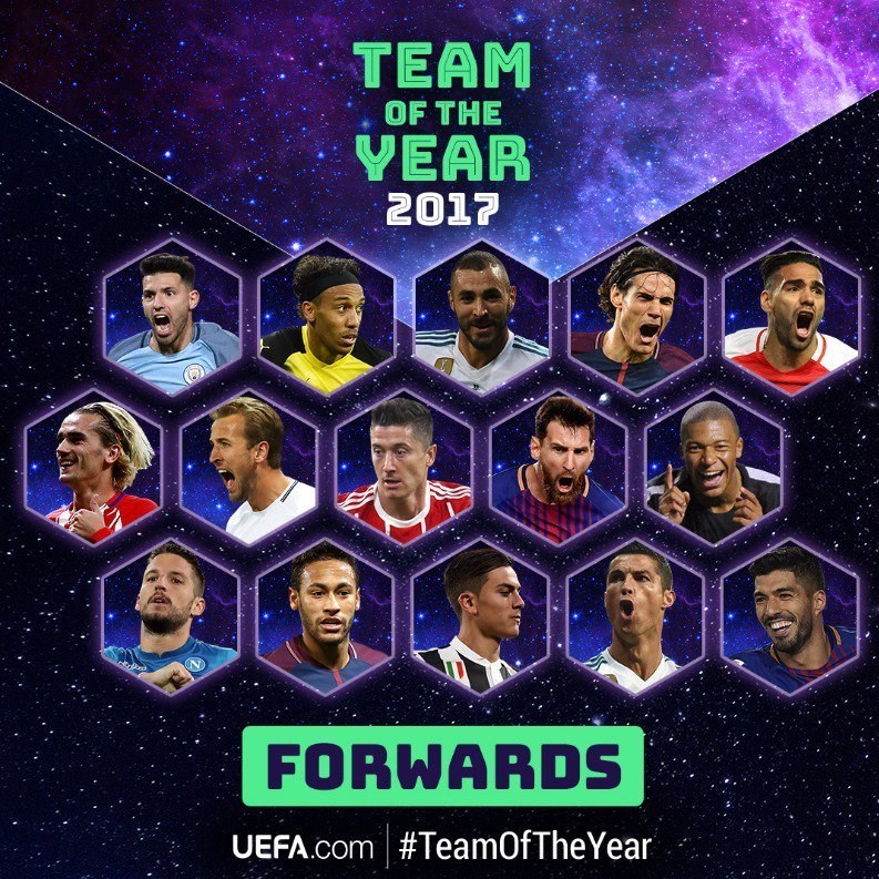 مهاجمان: سرخیو آگوئرو (منچسترسیتی)، پییر امریک اوبامیانگ (بوروسیا دورتموند)، کریم بنزما (رئال مادرید)، ادینسون کاوانی (پاریسنژرمن)، پائولو دیبالا (یوونتوس)، رادامل فالکائو (موناکو)، آنتوان گریزمان (اتلتیکومادرید)، هری کین (تاتنهام)، روبرت لواندوفسکی (بایرن مونیخ)، کایلیان امباپه (پاریسنژرمن)، دریس مرتنس (ناپولی)، لیونل مسی (بارسلونا)، نیمار (پاریسنژرمن)، کریستیانو رونالدو (رئال مادرید) و لوئیس سوارس (بارسلونا)