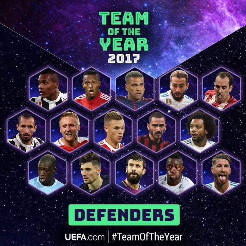 مدافعان: دنی آلوز (پاریسنژرمن)، لئوناردو بونوچی (میلان)، دنی کارواخال (رئال مادرید)، جورجو کیهلینی (یوونتوس)، کامیل کلیک (موناکو)، دیهگو گودین (اتلتیکو مادرید)، یاشوا کیمیچ (بایرن مونیخ)، مارسلو (رئال مادرید)، بنجامین مندی (منچسترسیتی)، توماس مونیه (پاریسنژرمن)، جرارد پیکه (بارسلونا)، سرخیو راموس (رئال مادرید)، داوینسون سانچس (تاتنهام)، الکس ساندرو (یوونتوس) و آنتونیو والنسیا (منچستریونایتد)