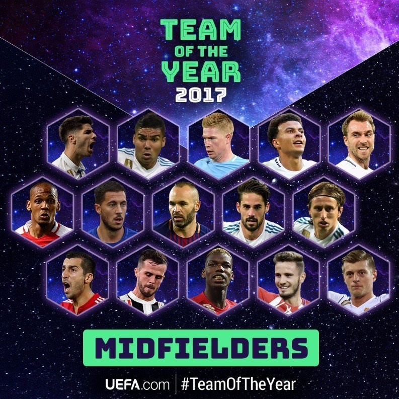 هافبکها: دله آلی (تاتنهام)، مارکو آسنسیو (رئال مادرید)، کاسمیرو (رئال مادرید)، کوین دیبروین (منچسترسیتی)، کریستین اریکسن (تاتنهام)، فابینیو (موناکو)، ادن اِزار (چلسی)، آندرس اینیستا (بارسلونا)، ایسکو (رئال مادرید)، تونی کروس (رئال مادرید)، هنریک مخیتاریان (منچستریونایتد)، لوکا مودریچ (رئال مادرید)، میرالم پیانیچ (یوونتوس)، پل پوگبا (منچستریونایتد) و سائول نیگوئس (اتلتیکومادرید)