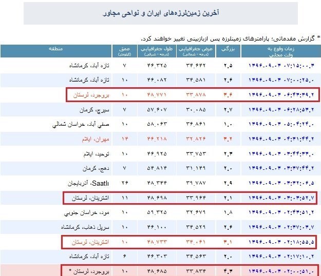 وی افزود: بامداد امروز سوم آذر ساعت 2 بامداد یک زمین لرزه 4.3 ریشتری و ساعت 6:43 صبح نیز زلزله 3.6 ریشتری شهرستان بروجرد و اشترینان را تکان داد و ساعت 2:18 دقیقه نیز یک زمین لرزه 3.1 ریشتری شهر اشترینان را به لرزه درآورد.