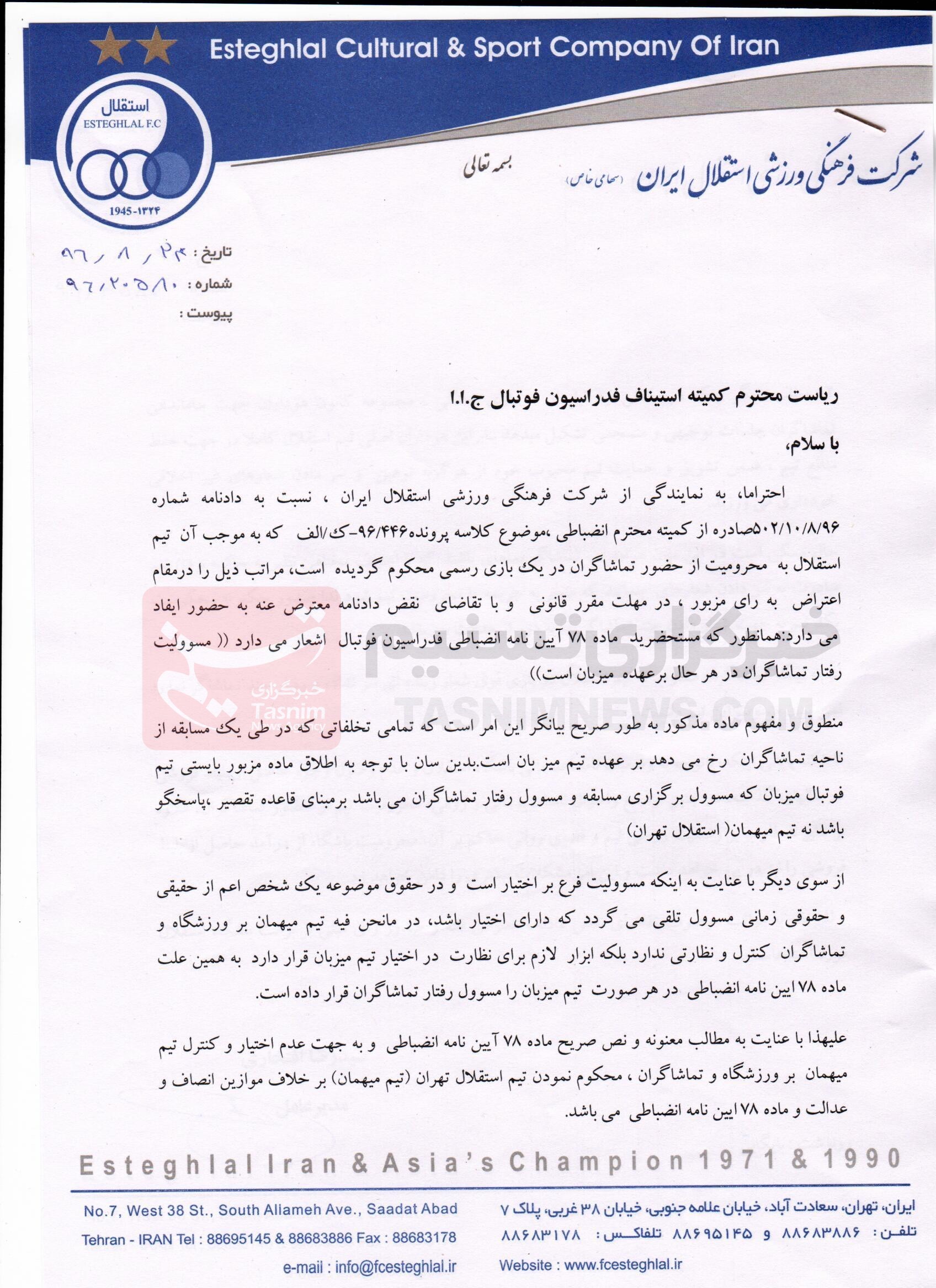 باشگاه استقلال طبق نامه زیر ادعا میکند در تاریخ 24 آبان درخواست خود را به فدراسیون فوتبال ارسال کرده است.