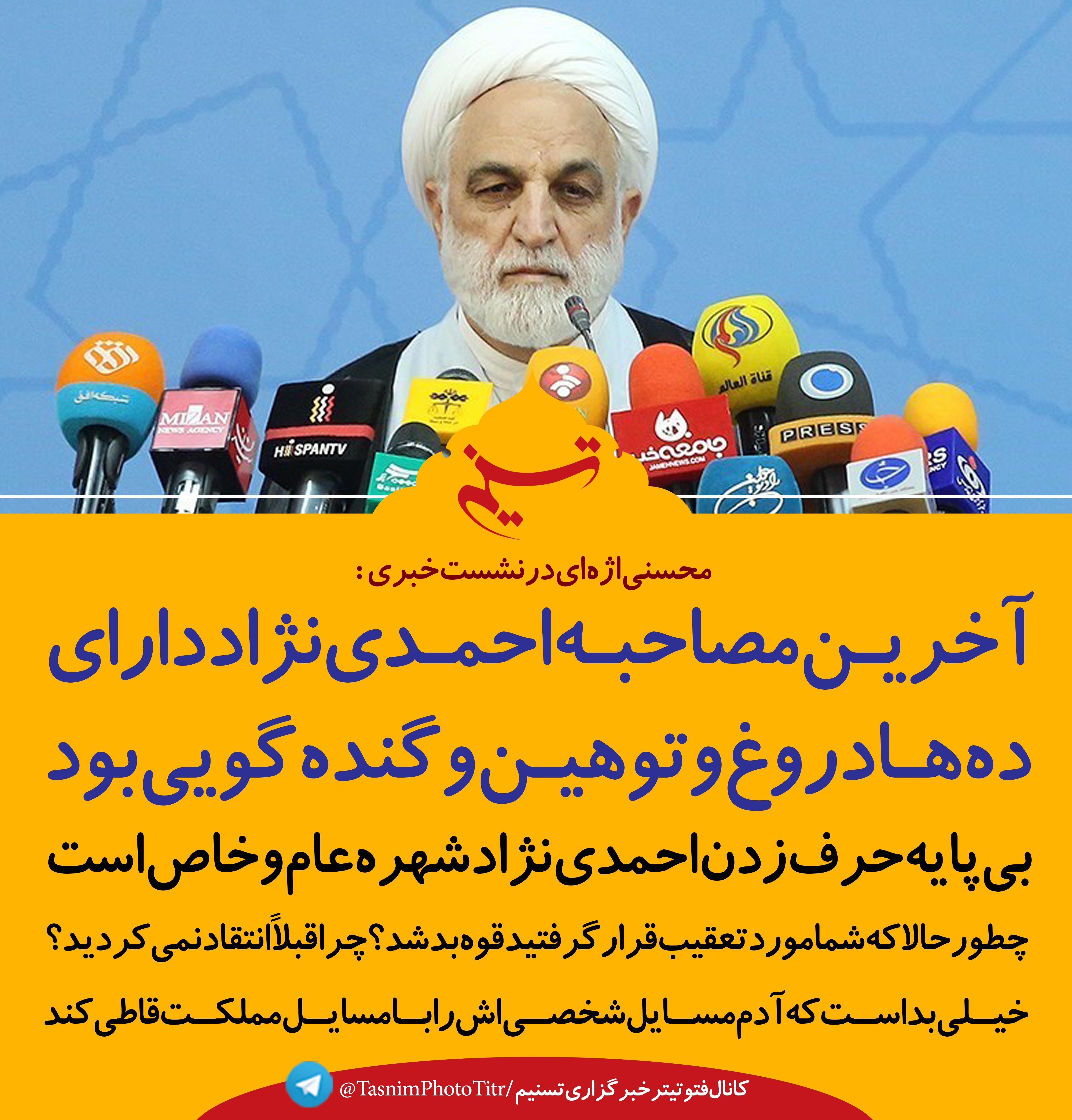 محسنی‌اژه‌ای گفت: یکی از صحبت هایی که احمدی‌نژاد این روزهای اخیر به عنوان مصاحبه کرد را نگاه کردم؛ حقیقتا ده‌ها دروغ و خلاف واقع و گنده گویی و توهین به این و آن بود.