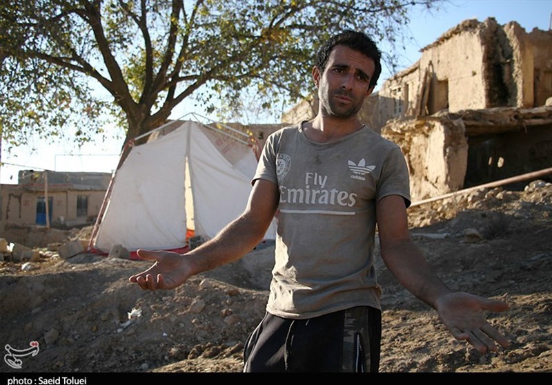محمد تمدنی یکی از مردان این خانه جلو میآید. میگویم صبرکن تا فیلم و تصویرت را ضبط کنم. کمی صبر میکند و بعد شروع میکند به صحبت کردن. میگوید: مهمترین مشکل فعلی ما نداشتن اعتبار برای ساخت منازلمان است. زلزله تمام خانه ما را تخریب کرد و حالا پس از گذشت چند ماه وقتی برای گرفتن وام و تسهیلات میرویم با مسائلی روبرو شدهایم که از دست ما کاری بر نمیآید.