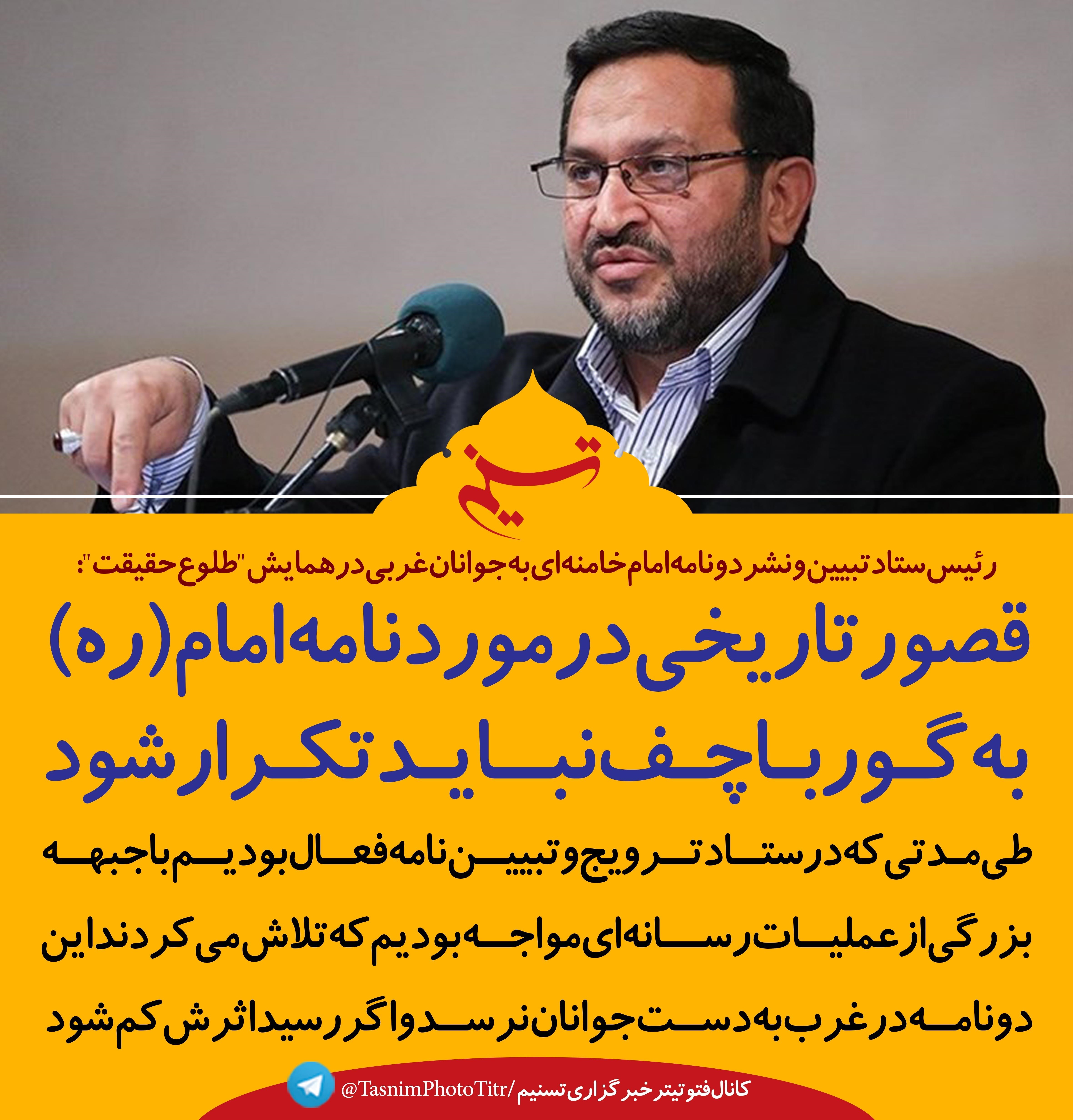 رئیس ستاد تبیین و نشر دو نامه مقام معظم رهبری به جوانان غربی گفت: ما در جریان نامه تاریخی امام راحل به گورباچف دچار یک قصور تاریخی شدیم و باید مراقب باشیم که در مورد این دو نامه مجدداً دچار کوتاهی نشویم.