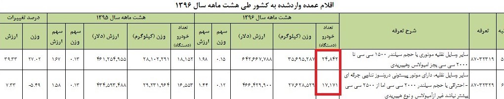 بر این اساس در کلاس 1500 تا 2000 سیسی حدود 25 هزار خودرو وارد کشور شده که نسبت به ماه مشابه سال قبل حدود 6هزار خودرو بیشتر وارد شده است. همچنین در کلاس 2000 تا 2500 سیسی نیز 17 هزار خودرو وارد کشور شده است. ارزش دلاری واردات این دو قلم کالا بیش از یک میلیارد و صد میلیون دلار بوده است.