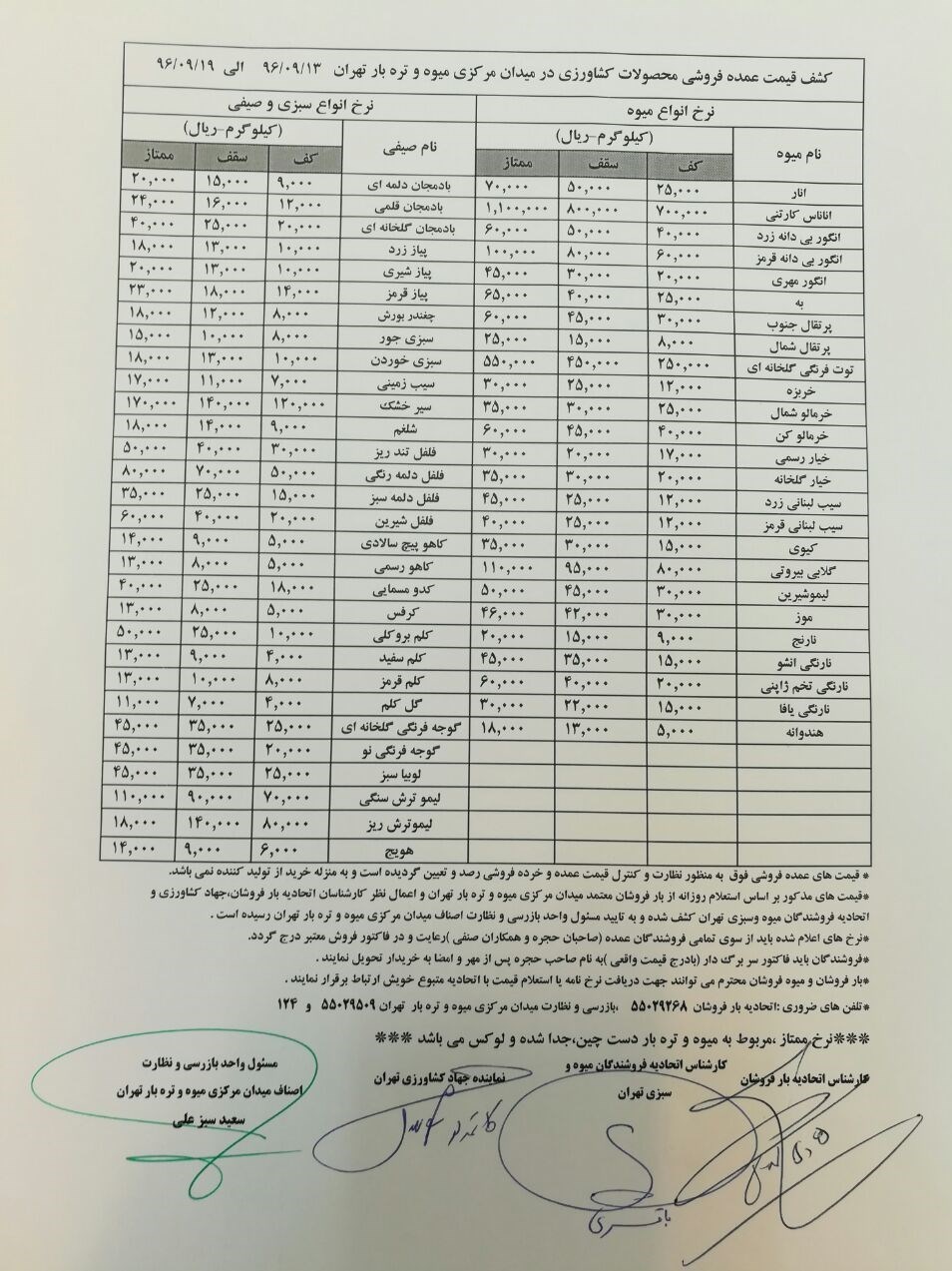 قیمتهای مذکور بر اساس استعلام روزانه از بارفروشان متعدد میدان مرکزی میوه و ترهبار تهران و اعمال نظر کارشناسان اتحادیه بارفروشان جهاد کشاورزی و اتحادیه فروشندگان میوه و سبزی تهران کشف شده و به تایید واحدهای بازرسی و نظارت اصناف میدان مرکزی میوه و ترهبار تهران رسیده است.
