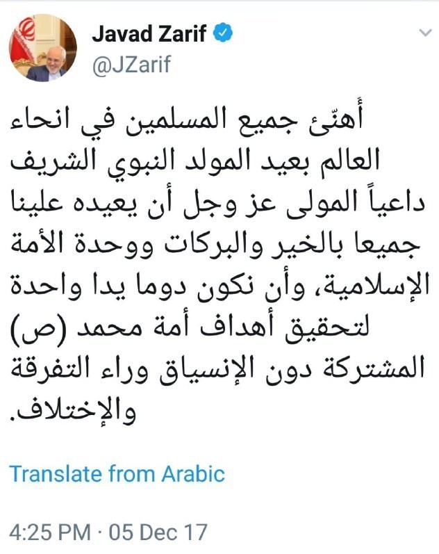 در پیام توئیتری ظریف آمده است:‌ به تمام مسلمانان در سرتاسر عالم عید میلاد پیامبر اکرم را تبریک گفته و از خداوند می‌خواهم که این عید را برای ما پر خیر و برکت و همراه با وحدت امت اسلامی قرار دهد و اینکه همیشه دستی واحد برای تحقق اهداف مشترک امت محمد (ص) باشیم، بدون اینکه در پشت تفرفه و اختلاف به فراموشی سپرده شود.
