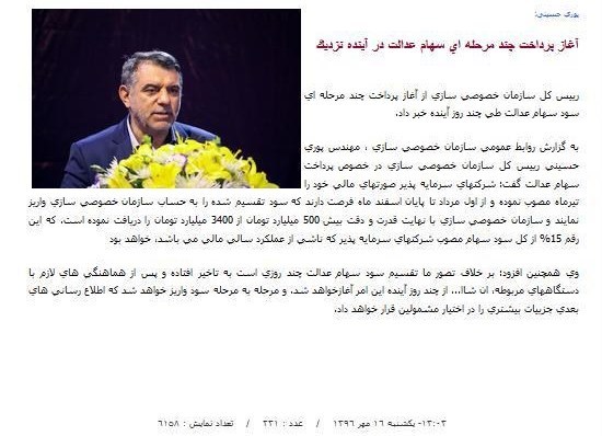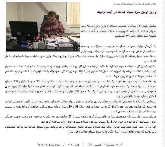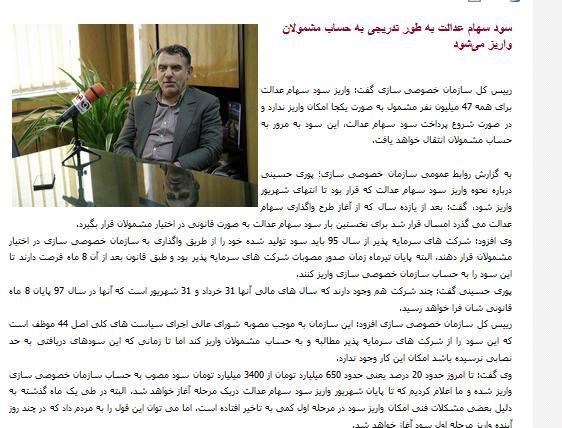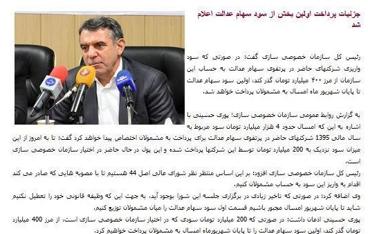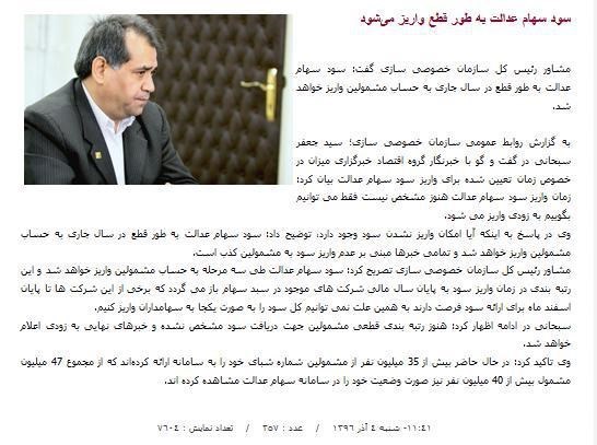 رییس سازمان خصوصیسازی هم که مدتی است اخبار واریز سود سهام عدالت را به رسانه ها اعلام می کند، بعد از خلف وعده در واریز سود تا پایان شهریور، اوایل مهرماه از واریز سود سهام عدالت تا یک ماه آینده خبر داده بود.
