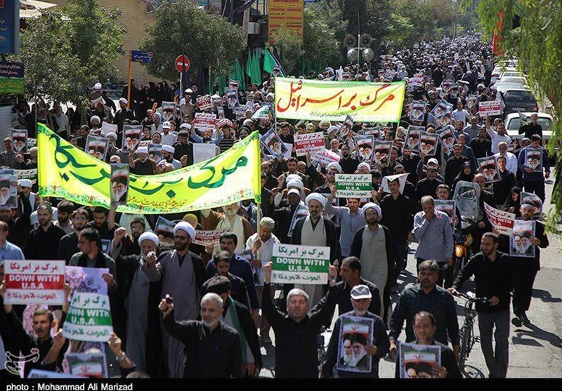 مردم مشهد با سر دادن شعارهایی مانند "مرگ بر آمریکا" و "مرگ بر اسرائیل" انزجار و نفرت خود را از مواضع مستکبران به نمایش گذاشتند.