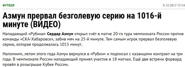 روزنامه معروف سویت اسپورت روسیه نیز در صفحه اول سایت رسمی خود آورده است: آزمون سریال گلنزدنش در لیگ برتر روسیه را پس از 1016 دقیقه شکست.