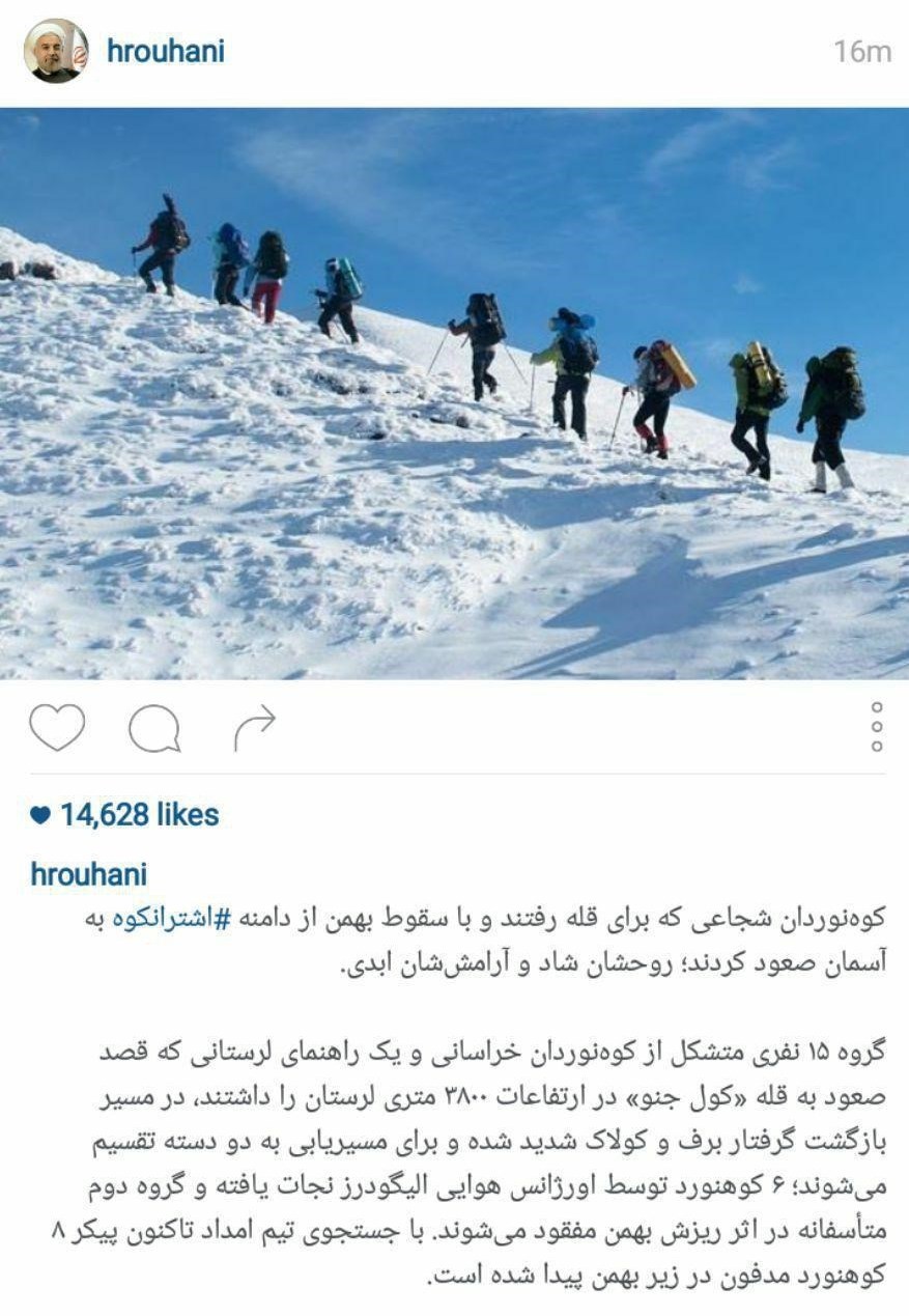 در پست رئیس جمهور آمده است: کوهنوردان شجاعی که برای قله رفتند و با سقوط بهمن از دامنه اشترانکوه به آسمان صعود کردند؛ روحشان شاد و آرامششان ابدی.
