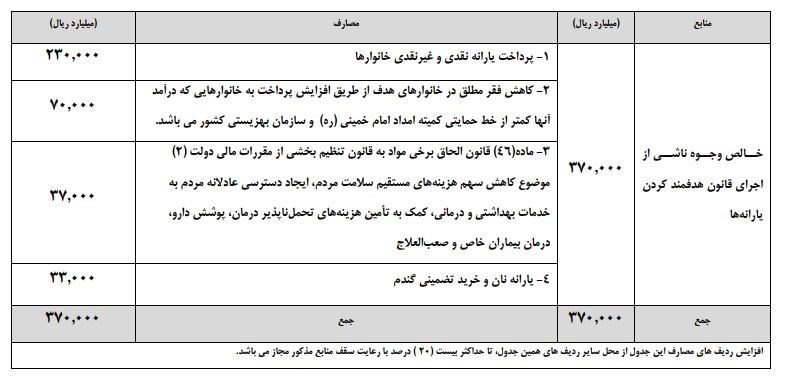 بر این اساس از رقم 37 هزار میلیارد تومان در نظر گرفته‌شده برای سال 97 قرار است 23 هزار میلیارد تومان به‌صورت یارانه نقدی و غیرنقدی توزیع شود. همچنین 7 هزار میلیارد تومان در قالب سیاست کاهش فقر مطلق از طریق بهزیستی و کمیته امداد توزیع می‌شود. همچنین 3700 میلیارد تومان به‌عنوان یارانه بخش سلامت و 3300 میلیارد تومان به‌عنوان یارانه نان در نظر گرفته شده است.