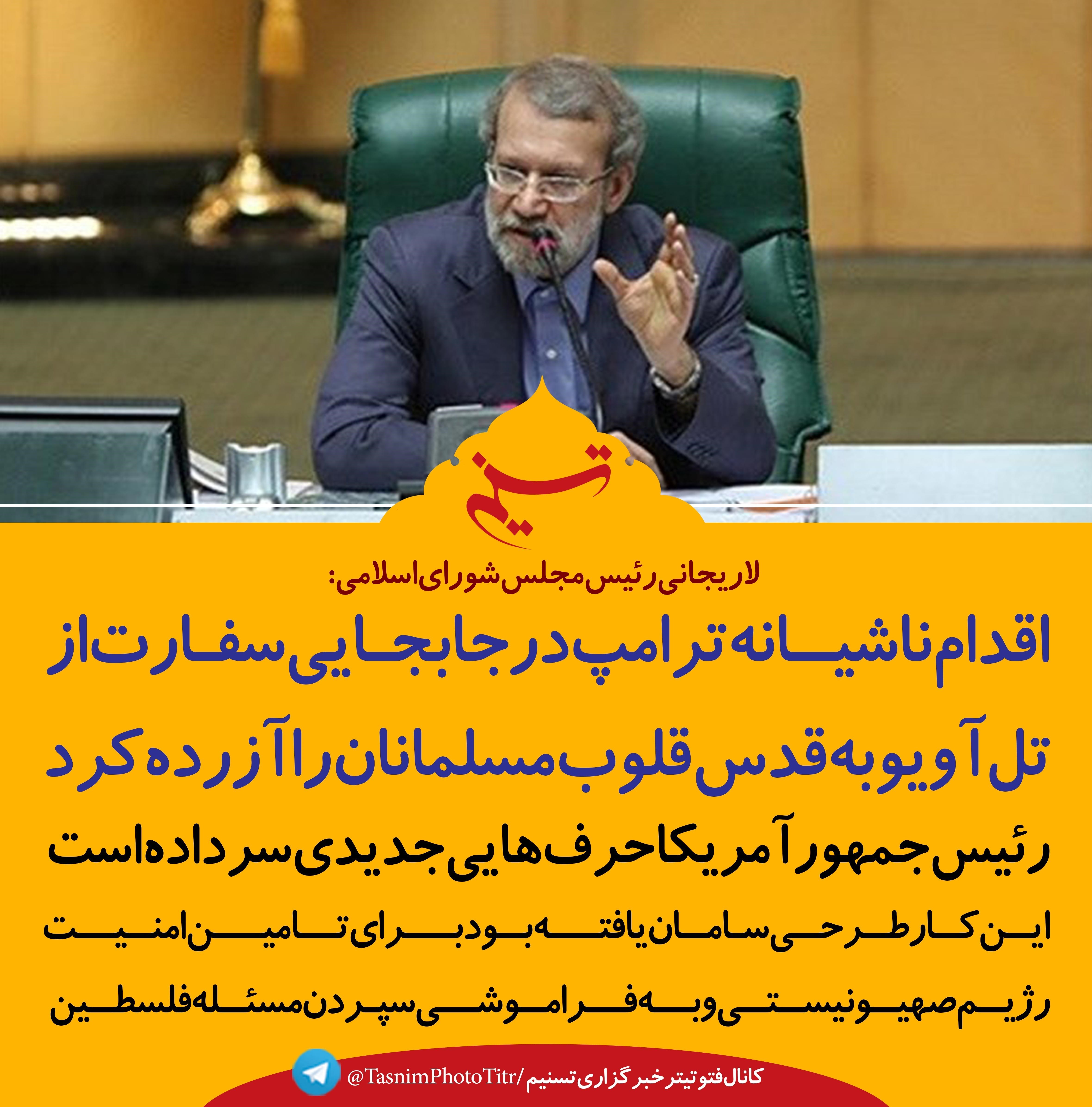 فتوتیتر/لاریجانی:اقدام ناشیانه ترامپ در جابجایی سفارت از تل آویو به قدس قلوب مسلمانان را آزرده کرد