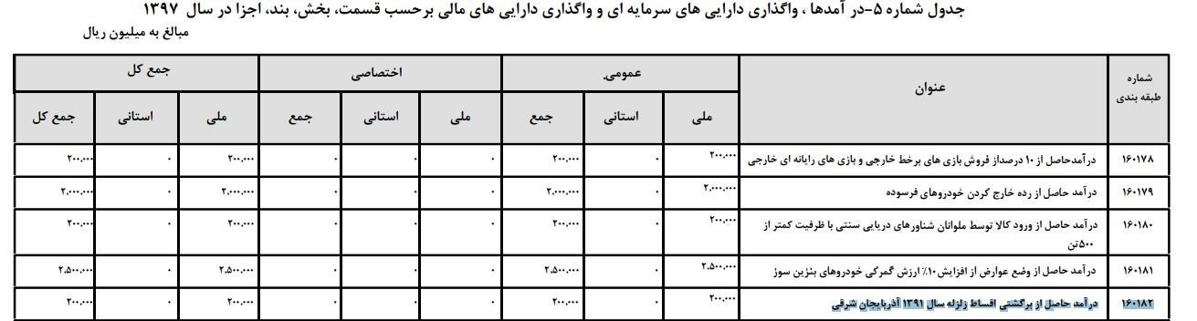 به گزارش خبرنگار اقتصادی خبرگزاری تسنیم، دولت در جدول درآمدهای لایحه بودجه 97 کل کشور، 200 میلیارد ریال درآمد از محل برگشتی اقساط زلزله سال 1391 آذربایجان شرقی پیش بینی کرده است.