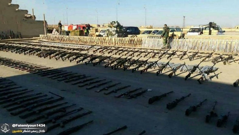 تصویر زیر نیز مهمات و تسلیحات ضبط شده از داعش توسط رزمندگان فاطمیون و دیگر نیروهای مقاومت در روستاهای آزاد شده میان البوکمال و المیادین در استان دیرالزور است.