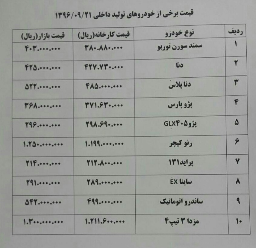 قیمت تعدادی از خودروهای داخلی به شرح زیر است: