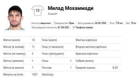 میلاد محمدی بیشترین دقایق حضور در نیم‌فصل اول لیگ برتر روسیه را در میان لژیونرهای ایرانی به خود اختصاص داد این مدافع جوان ایرانی در ترکیب اصلی 11 بازی تیم احمد گروژنی به میدان رفت و 2 بازی نیز به عنوان بازیگن جایگزین وارد میدان شد.