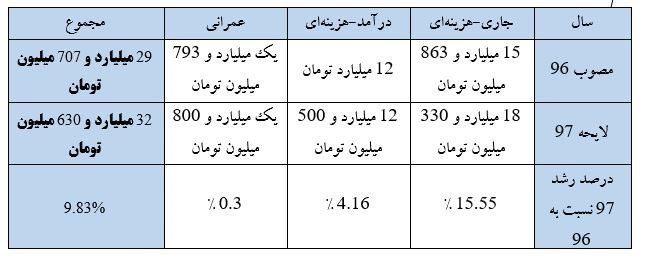 جدول زیر ارقام بودجه در سرفصلهای جاری-هزینهای، عمرانی و درآمد اختصاصی برای دو سال 96 و 97 را نشان داده است.